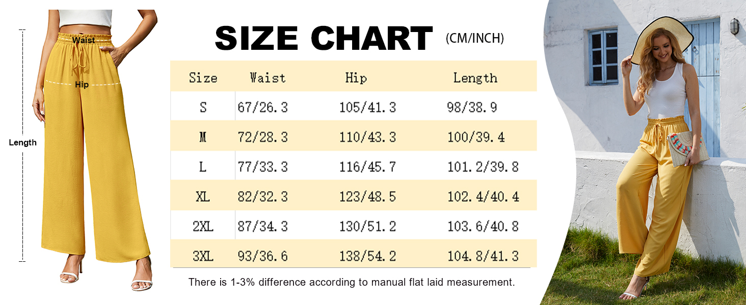 The chart includes a note indicating a 1-3% difference due to manual flat laid measurements. Each size is represented with corresponding waist, hip, and length measurements, assisting customers in selecting their ideal fit.